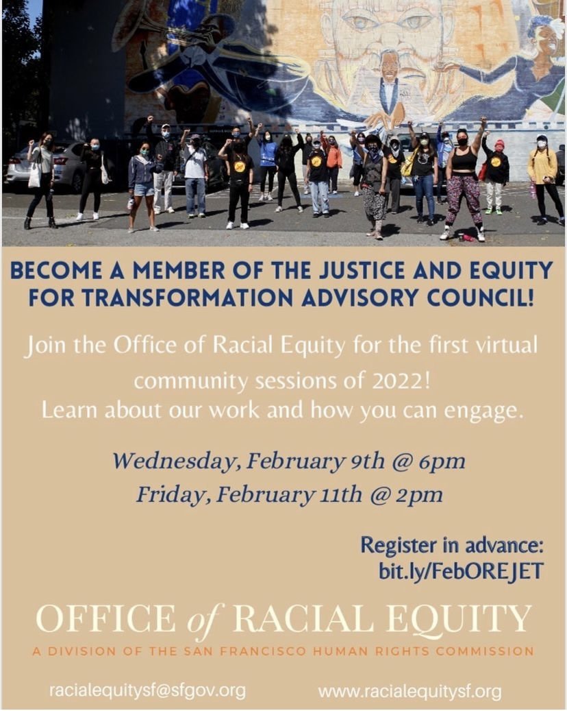 Join the Office of Racial Equity for our first virtual community sessions of 2022! Learn about how to become a member of our advisory group, the Justice and Equity for Transformation Council.